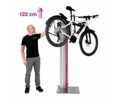 Der große Hub von 1225 mm ermöglicht es, die Fahrräder vom Boden aus anzuheben und in eine optimale Montagehöhe zu bringen. Die Drehachse ermöglicht zudem ein endloses Drehen in jeder Höhe.