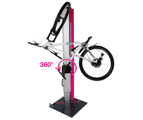Der Bike proStand ist eine stationäre, elektrisch betätigte Montagevorrichtung für Fahrräder, Lastenfahrräder und E-Bikes bis 40 kg Gewicht. Ohne elektrische Drehachse ist er sogar bis 70 kg belastbar.