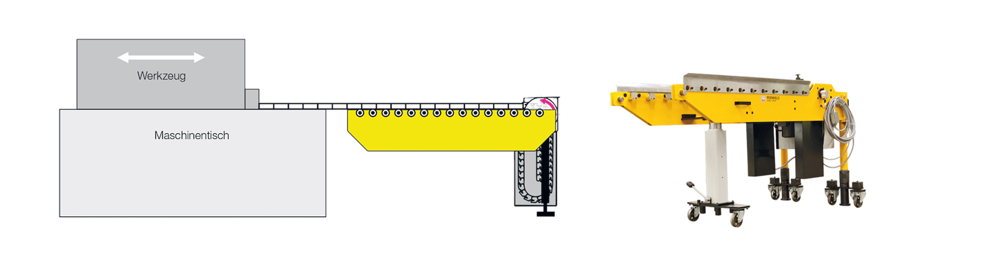 Die über einen Schubkettenantrieb elektrisch angetriebene Konsole ist besonders kompakt aufgebaut und lässt sich ohne Weiteres auch an niedrigen Pressentischen und in schwer zugänglichen Umgebungen einsetzen. Sie kann abwechselnd an unterschiedlichen Pressen montiert und problemlos in teil- oder vollautomatisierte Prozesse eingebunden werden.