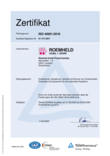 Zertifikat für die: Römheld GmbH Friedrichshütte - Arbeits- und Gesundheitsschutzmanagement - EN ISO 45001:2018