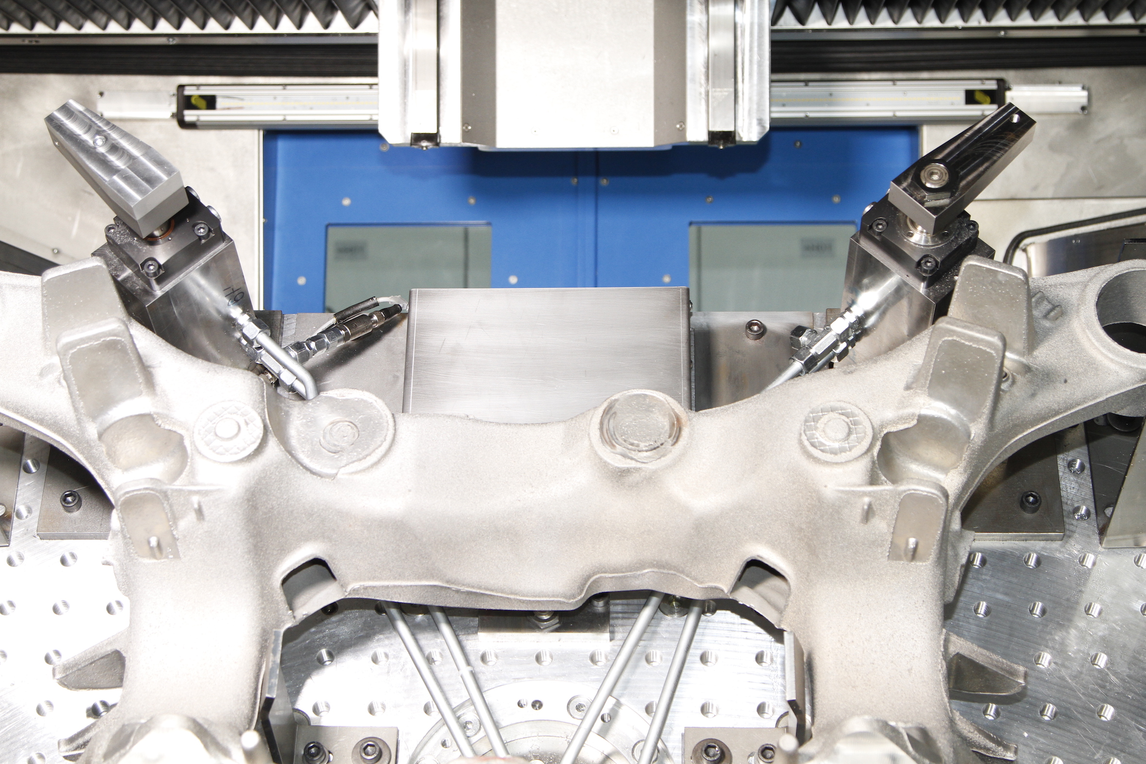 Both companies were looking for a solution to the problem that undetected faulty cast aluminium blanks cause unnecessary costs. This is because the components are usually only inspected after machining. Especially in the automotive industry, lightweight aluminium parts, which are particularly thin-walled and filigree, often end up as rejects. This can be drastically reduced with the new clamping concept.