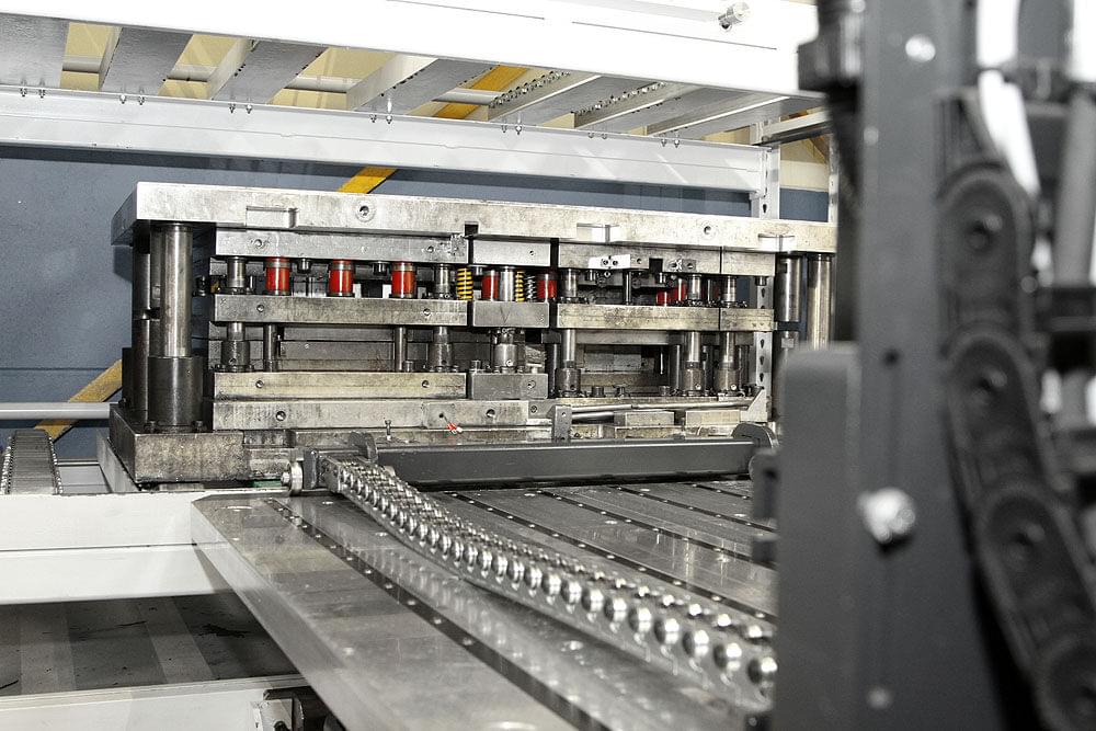 There are different versions for different spatial situations at the press. If the press bed is high enough, the chain is mounted hanging downwards in the storage unit. Since the chain box is open at the bottom, it is also insensitive to dirt. However, if the press bed height is too low to store the chain, a magazine storage is available where the chain is stored in a spiral.