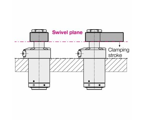 In this version without axial swing stroke, the clamping arm swivels in one plane and does not make any axial movement when swivelled.