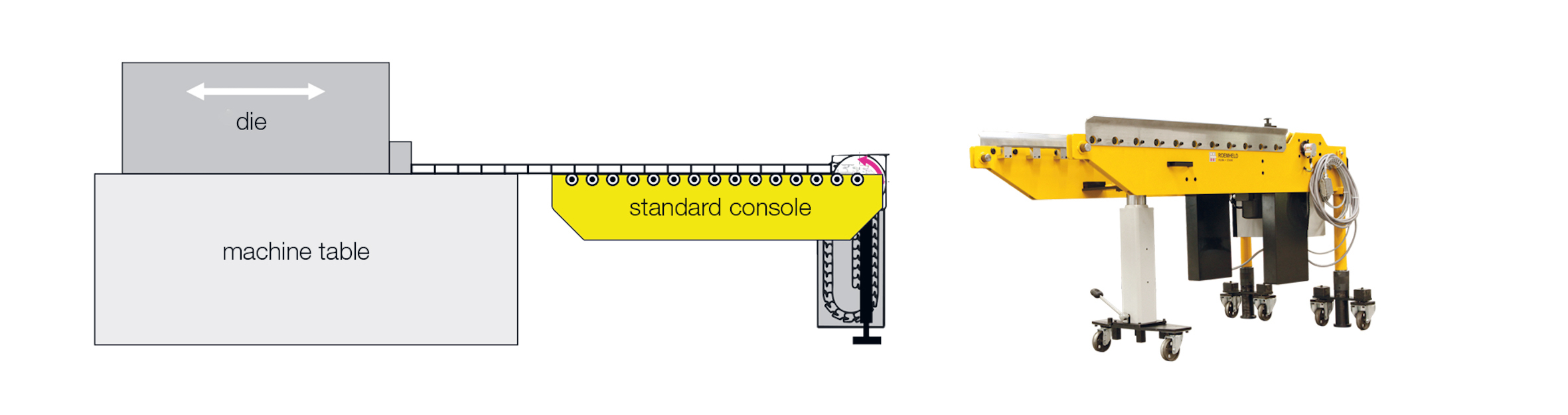 ROEMHELD: nouvelle console mobile de changement d'outils avec une capacité de charge jusqu'à 50 t pour le formage de la tôle. Forme compacte pour les tables de presse basses, les presses alternées et les espaces restreints.