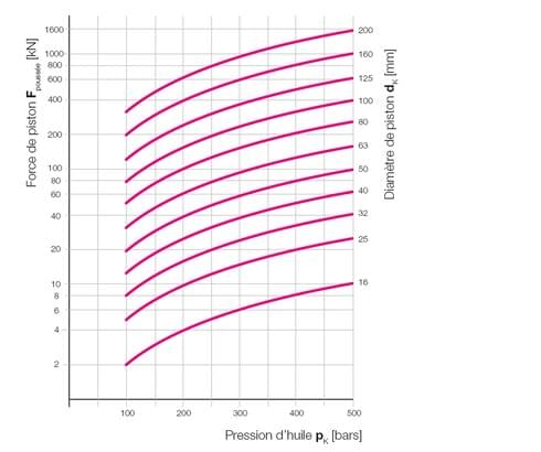 Le graphique de droite montre la relation entre la pression d'huile, la force du piston et le diamètre du piston.